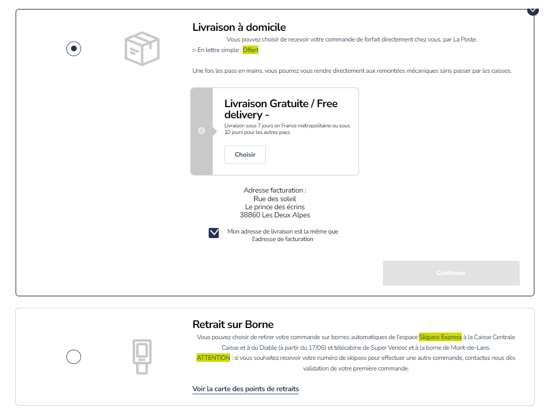 Vous pouvez choisir de recevoir votre commande de forfait directement chez vous. Pour cela, sélectionnez la livraison à domicile dans le choix des informations de livraison.