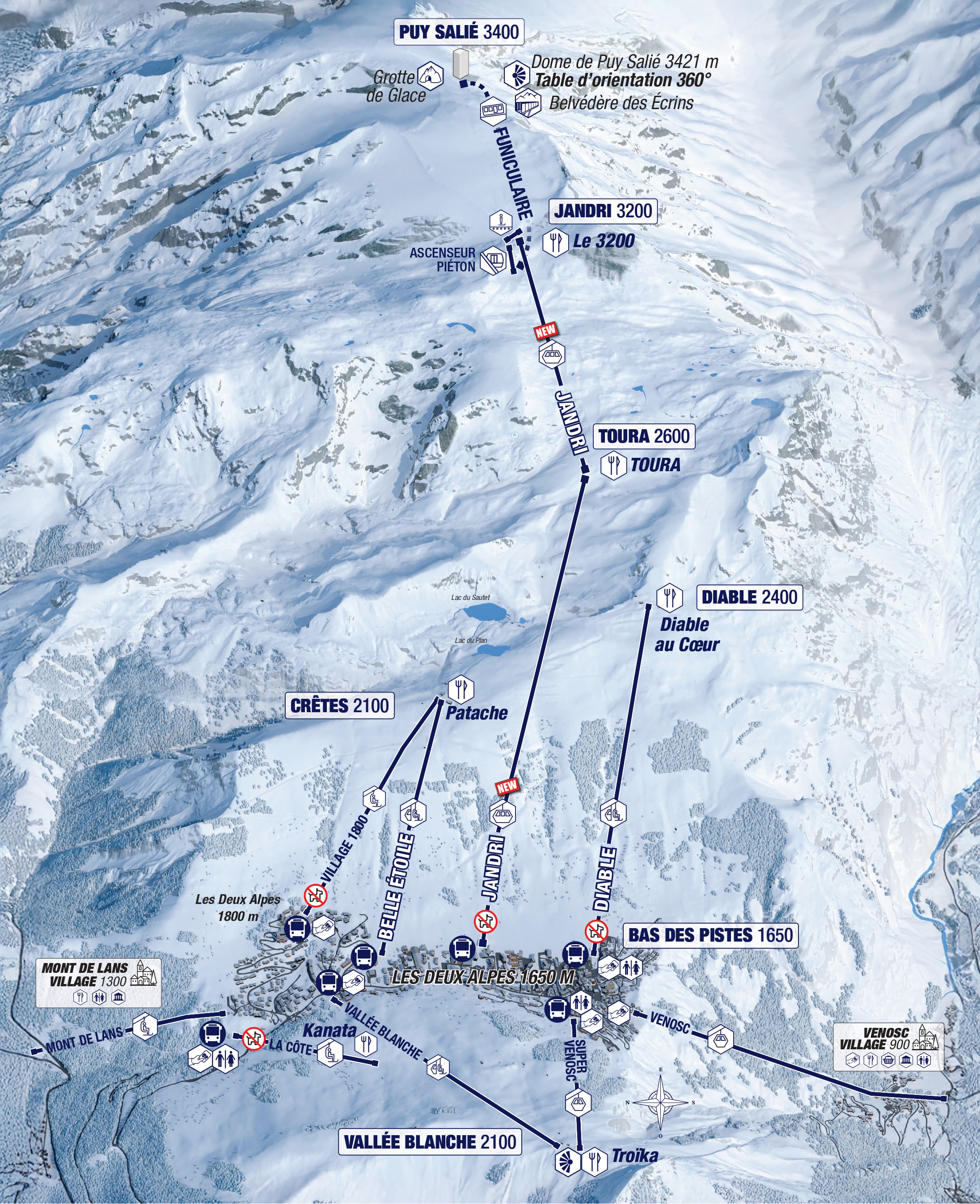 Accédez au sommet du glacier des 2 Alpes, à 3400m d'altitude, rapidement et sans effort grâce à la nouvelle remontée du Jandri et à la rénovation du funiculaire.