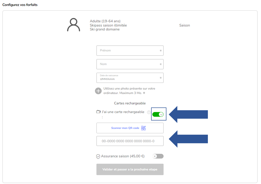 Étape 3 : Personnalisez vos skieurs et indiquez que vous avez des cartes à recharger. Complétez les numéros de carte ou choisissez une carte en votre possession dans le menu déroulant.